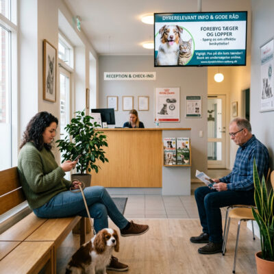 En instoreskærm i venteværelset giver klinikken mulighed for at kommunikere med klienterne på en enkel og professionel måde. Mens klienterne venter, kan skærmen vise relevant indhold om dyresundhed, forebyggende behandlinger, ernæring eller træning.